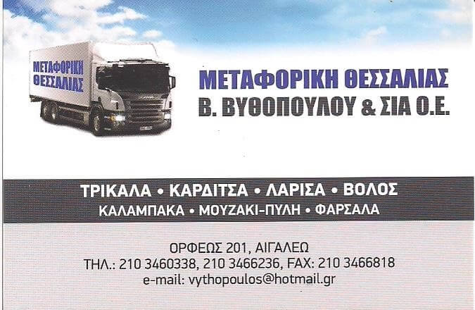H μεταφορική εταιρία “ΒΥΘΟΠΟΥΛΟΥ” με καθημερινές αποστολές και μεταφορές σε όλη την Θεσσαλία Τρίκαλα Καρδίτσα Λάρισα Βόλο με άμεση παράδοση.Ωράριο Λειτουργίας